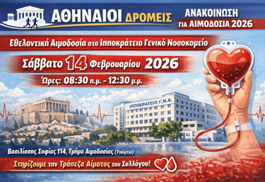 Ο Αθλητικός Πολιτιστικός Σύλλογος «Αθηναίοι Δρομείς» στα πλαίσια της κοινωνικής ευαισθησίας και προσφοράς προς τον συνάνθρωπο, διοργανώνει, όπως κάθε χρόνο, αιμοδοσία που θα πραγματοποιηθεί στο «Ιπποκράτειο» Γενικό Νοσοκομείο, Βασιλίσσης Σοφίας 114, στο τμήμα αιμοδοσίας (υπόγειο), το Σάββατο 14 Φεβρουαρίου 2026 και ώρες 08:30 π.μ. – 12:30 μ.μ., ενισχύοντας παράλληλα και την Τράπεζα Αίματος του Συλλόγου.
